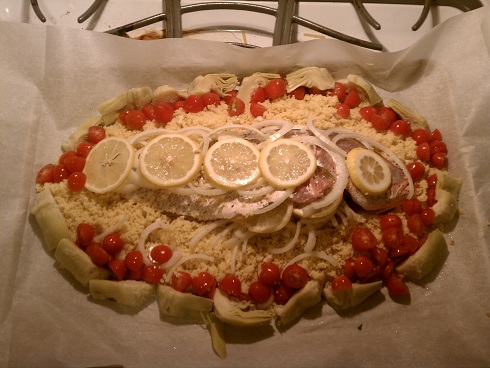 This was a simple recipe I saw made on TV by Alton Brown and I found the it online. It’s basically a whole snapper with cous cous, onion, artichoke heart, cherry tomato, lemon, white wine, and butter seasoned with salt and pepper. Wrap in in parchment paper, completely seal it, and allow it to cook for 30 mins until tender. It’s hard to find whole fish at the standard supermarket but if you do find it I recommend this recipe.